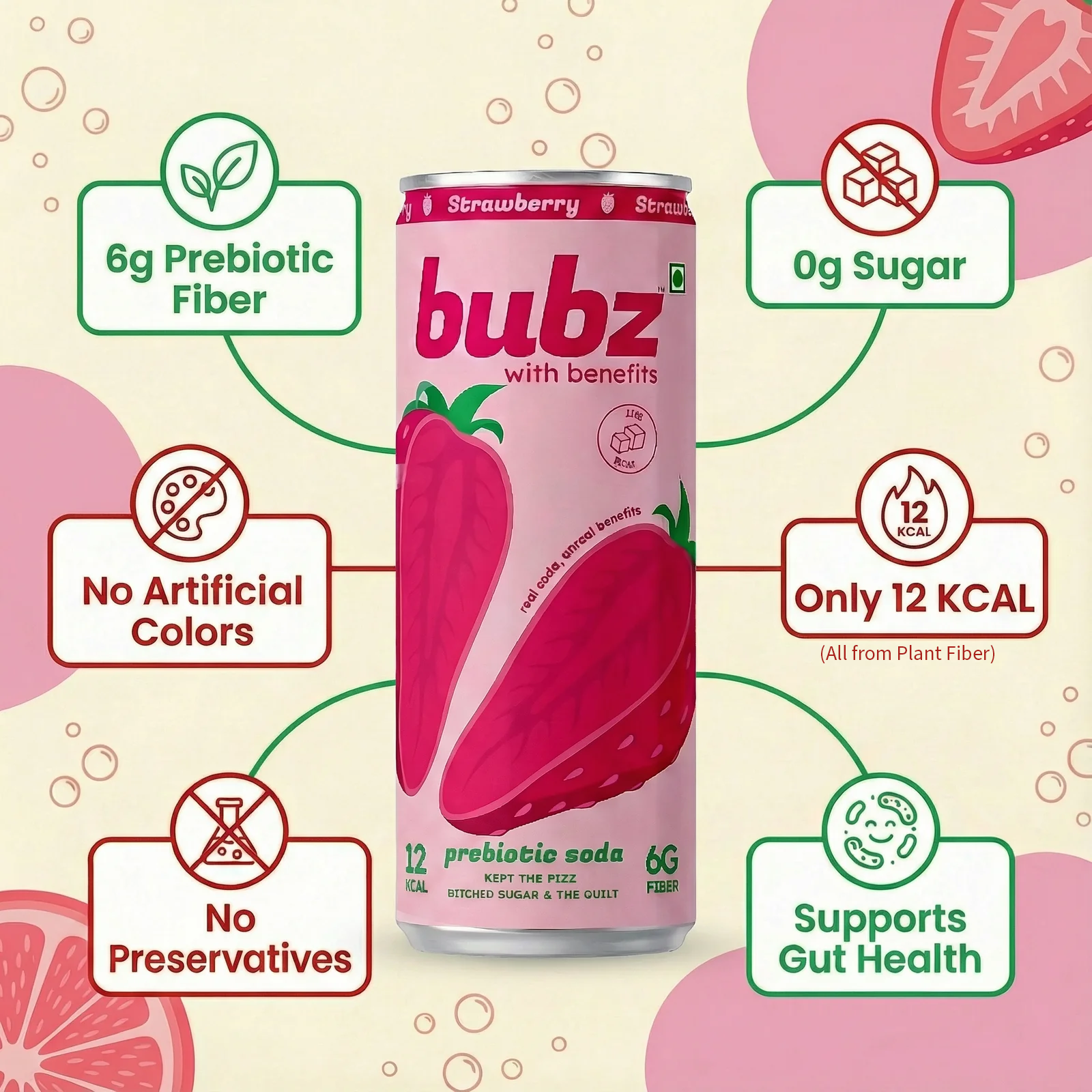 • Prebiotics are fuel for your gut. They feed the good bacteria in your digestive system, helping with digestion, immunity, metabolism, and even mood balance. Every can of Bubz has 6g of prebiotic fiber the same as a bowl of oats, but in a crisp, refreshing soda.