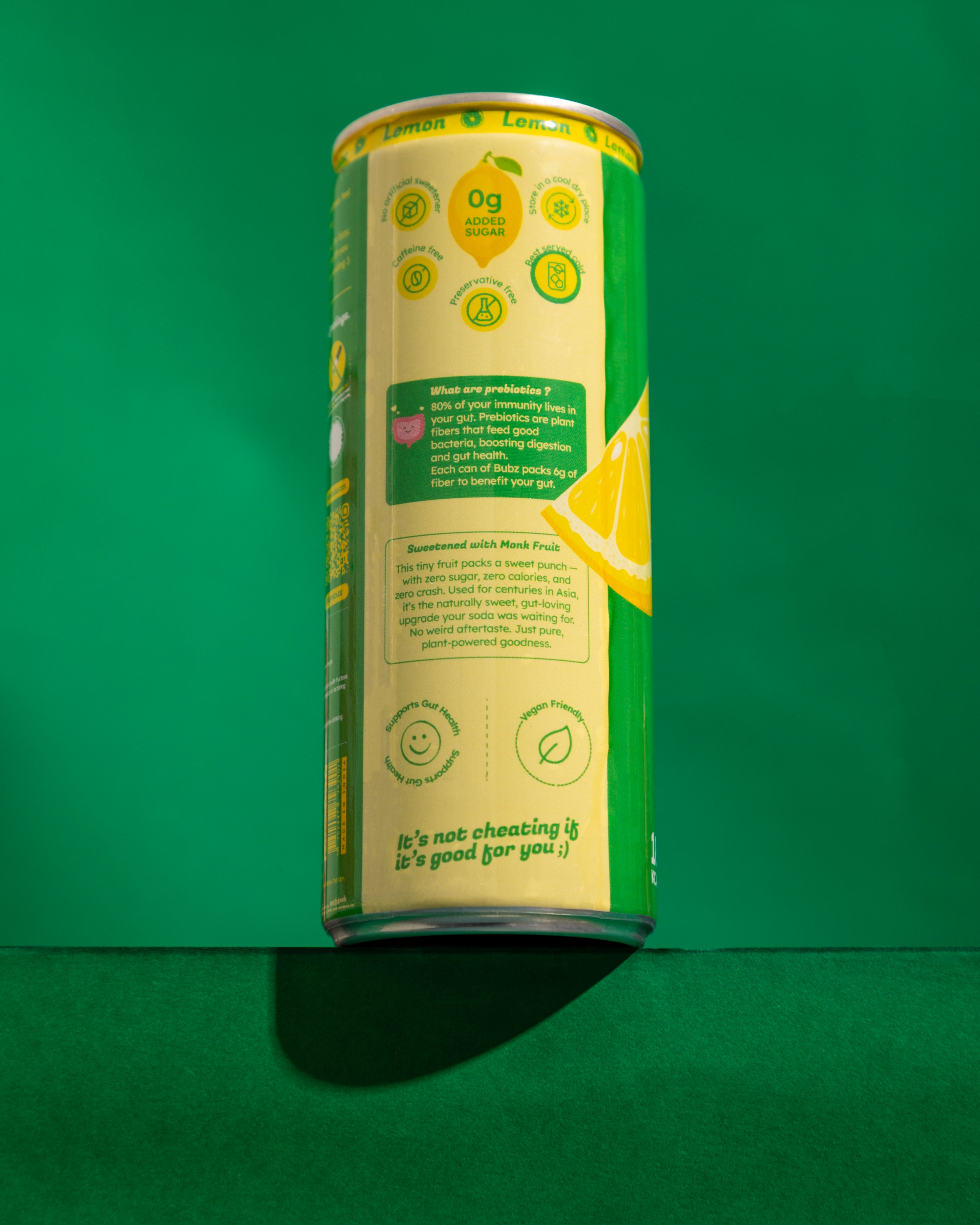 • Prebiotics are fuel for your gut. They feed the good bacteria in your digestive system, helping with digestion, immunity, metabolism, and even mood balance. Every can of Bubz has 6g of prebiotic fiber the same as a bowl of oats, but in a crisp, refreshing soda.